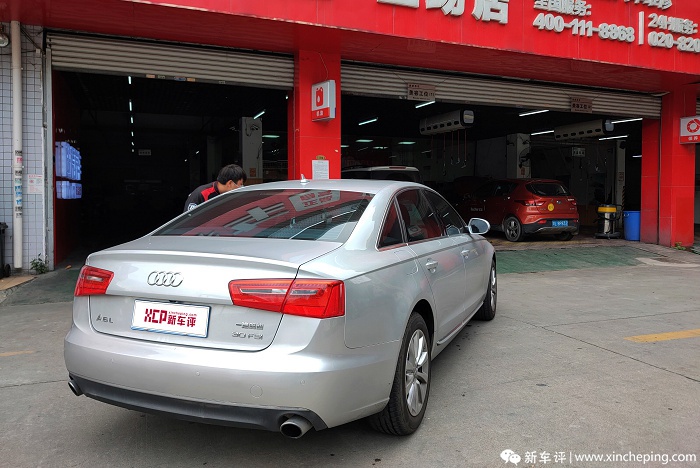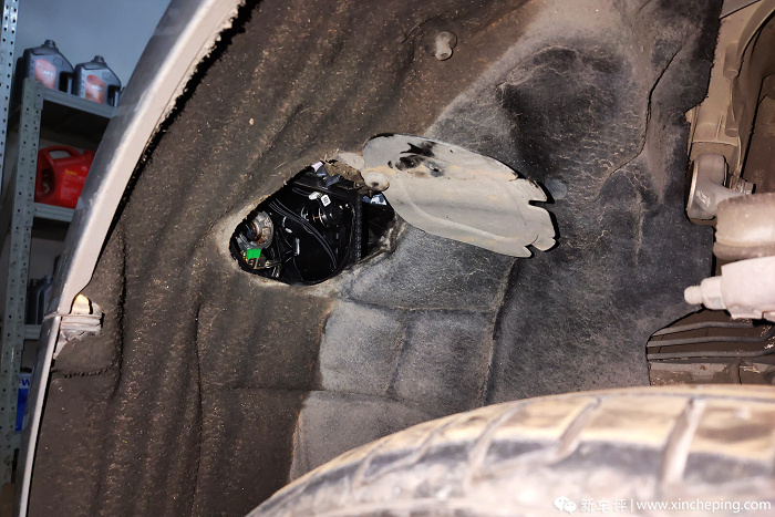 换完机油就接着换氙气灯泡。德系车因为机舱里机件排得很密,所以换大灯灯泡一般是比日系车要费劲些的。和C6代的A6L类似,C7代也是在前轮拱内打开这个小盖子,然后把手伸进去换。如果你换灯泡时没有举升机,就要把轮子往一边打到头,才比较好施工。如果在这种有举升机的地方,把车子抬起来一点、让轮子自然垂下,空间就出来了,就好换多了。