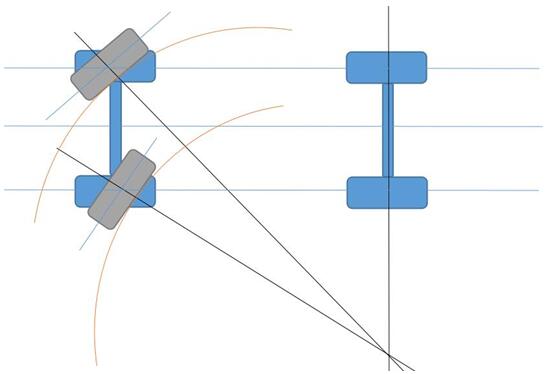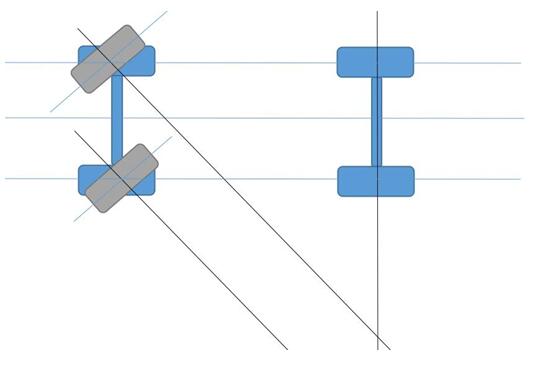 它的大概意思就是在车辆转向的时候,前边两个车轮划过两条弧线,这两条弧线肯定各有一个围绕运动的圆心,另外后边的车轮没有左右转动,所以后边两车轮垂直于车轮轴线方向。而阿克曼机构就是为了让前边两车轮围绕同一个圆心“画弧线”,并且这个圆心要在后车轮轴线延长线上。如果实在理解不了,就对照文字看下图。