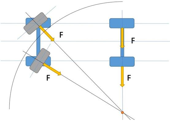 因为车辆正常转弯都需要一个指向弯道内测的向心力,这个向心力是由四个车轮与路面产生的摩擦力提供,而摩擦力的方向正好是转弯弧线所指圆心的方向,以及后轮轴线延长线方向。团结力量大,只有四个车轮轴线尽量指向同一个圆心,才能产生更大的合力,既转向所需的向心力,转弯才会更轻松、更顺畅。