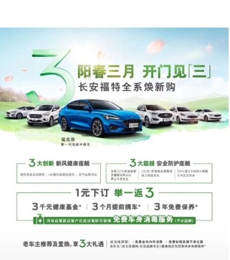 3月31日以前,在福特商城成功下订,即可获得3000元健康基金,用于购车款核销减免。
