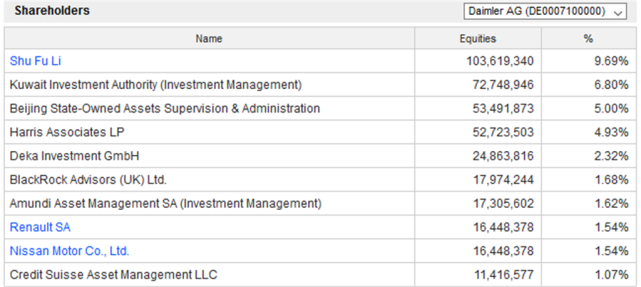 那么在被吉利掺一脚之前,戴姆勒的股东组成属于很安全的状态,主要股东分别是科威特主权基金、贝莱德集团、日产、雷诺,他们的股比都没超过10%。科威特主权基金是历史悠久的政府投资机构,基本只是为了把卖石油赚的钱拿出去钱生钱,以备不时之需,好比说海湾战争的时候,入侵的伊拉克军队点燃了科威特很多油井,使其在很长一段时间里丧失了石油收入,要是没有这个基金做支撑当时就得喝西北风。所以科威特主权基金没什么政治企图,就图个利,连我国的高铁项目里都有它的资金。贝莱德这个私募基金也是一个意思,为了利而已。至于日产和雷诺,那是联盟伙伴。戴姆勒剩下的股份则都分散在投资机构和个人投资者手里,掀不起大浪但是能帮助吉利暗度陈仓。