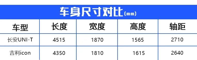 车身尺寸方面,长安UNI-T的长宽高分别为4515/1870/1565mm,轴距为2710mm。而吉利icon的长宽高分别为4350/1810/1615mm,轴距为2640mm。显然,长安UNI-T在身形方面更显优势。
