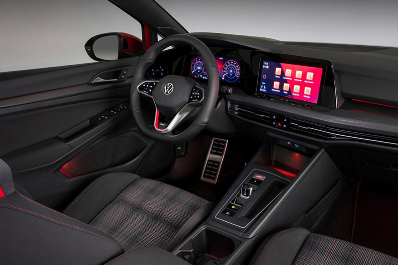 内饰方面,新车设计大多沿用了第八代高尔夫的设计,采用了10.2英寸全液晶仪表盘和10英寸的中控娱乐屏幕,同时车内氛围灯也有30种颜色可选,新车也将搭载了全新的电子挡把。GTI上经典的格子布座椅也经过了重新的设计采用了独有的红色缝线和装饰,更细腻也更显档次。