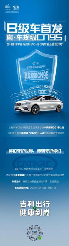 而博瑞作为吉利旗下精品车,则成为B级车中首个可为现有车主免费更换“CN95滤芯”的车型,再一次为B级车树立标杆。