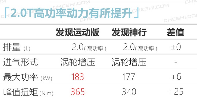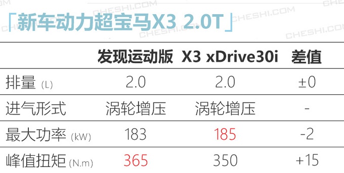 新车切换至PTA架构打造,动力方面增加了48V混动系统,在低速滑行阶段发动机关闭,起步时为发动机提供助力。发现运动版全系搭载2.0T发动机,入门版为低功率版,最大功率147kW,峰值扭矩320N.m;其余车型均为高功率发动机,最大功率183kW,峰值扭矩365N.m,相较老款车型动力有所提升,扭矩输出超宝马X3 (配置|询价)搭载的高功率2.0T发动机。