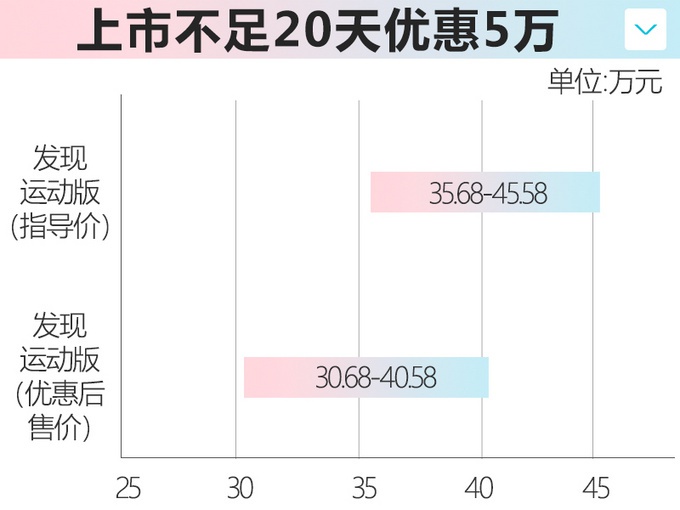 路虎发现神行中期改款车型更名为“路虎发现运动版 (配置|询价)”,于今年2月14日正式上市,共推出5款车型,售价区间为35.68万元-45.58万元。网上车市从捷豹路虎经销商处了解到:目前路虎发现运动版现金优惠幅度达5万元。此前捷豹路虎产品在国内市场就有着较大的优惠幅度,被消费者戏称“七折豹八折虎”,发现运动版作为一款中期改款车型,至少还将有3-4年的生命周期,随着时间的推移,预计优惠幅度还将增大。