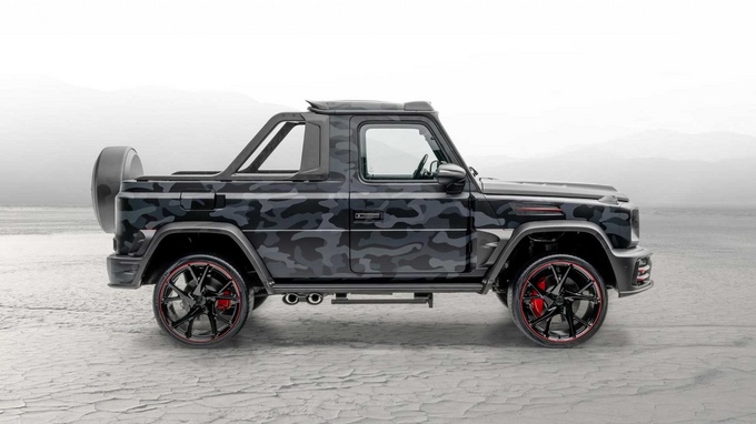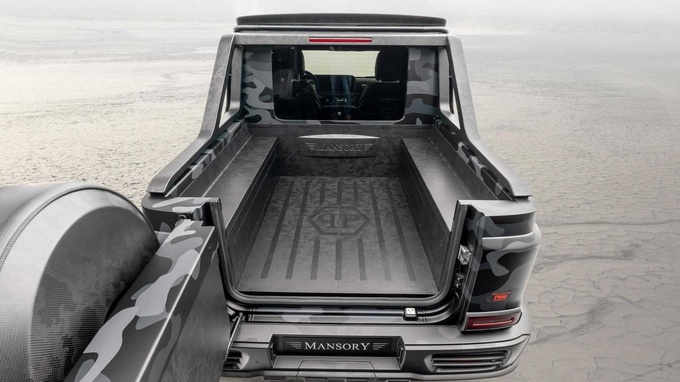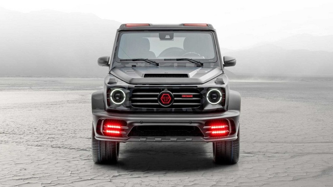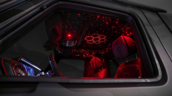 今年迈莎锐准备卷土重来,不过这次他们将奔驰G63改装成了一台皮卡,这台皮卡采用了和此前SUV版改装车型相同的外观造型设计风格,包括灰色的外观涂装、24英寸合金轮毂、红色LED发光装饰灯光和各种碳纤维组件,他们还在在驾驶室内部安装了一个红色多边形星空式氛围灯。