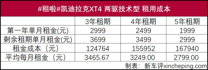 1999元月租当然可以有,但有两个限制条件,只能选择最便宜车型和只有第一年可以享有。还是以凯迪拉克XT4 两驱技术型为例,租期分别为3、4、5年的租金费用统计如下。