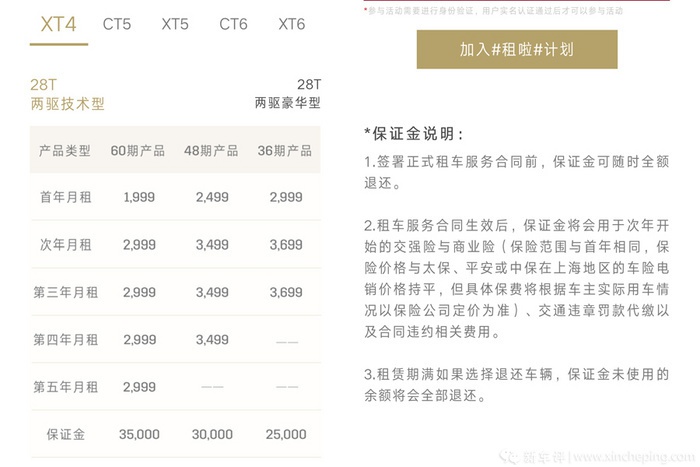 在文章开头我说了贷款买车是需要启动资金的,其实凯迪拉克这个租啦计划也是需要的,那就是保证金,不同车型不同租期需要不同的保证金,以官方指导价为25.97万的凯迪拉克XT4 两驱技术型为例,租期3、4、5年分别要交2.5万、3万、3.5万保证金。这个保证金有什么用呢?用于购买次年开始的保险费用、交通违章费用、合同违约相关费用,如果租约到期保证金还有剩余,那就退还剩余部分。这么看来,这个保证金虽然不是贷款买车时的“首付”,但是也是拥车进程中的启动资金,只不过是换了种形式,而且金额也要低一些而已。