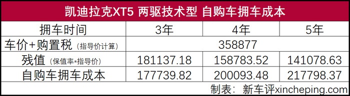 XT5的3、4、5年租金详情请看上图,可以看到5年租期需要付出的租金并不少。至于贬值成本,在国内过大型汽车网站上查询XT5的3年、4年、5年保值率分别为54.94%、48.16%、42.79%,通过计算后即可得到相对应的贬值,再加上购置税就可以得出相对应的拥车成本了。
