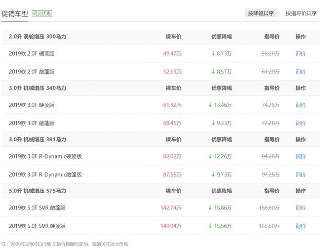 据汽车之家经销商报价,捷豹F-type如今的优惠幅度在8万元以上,2.0T车型优惠后售价跌进50万。