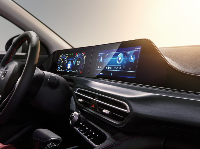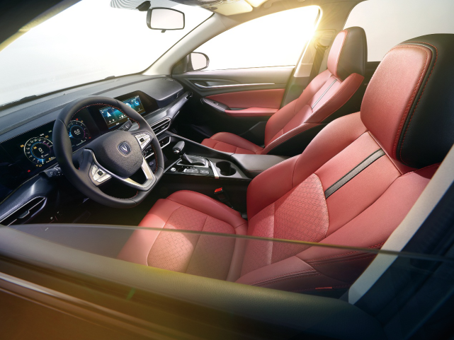车内最抢眼的自然是连为一体的双10.25英寸显示屏,屏幕分辨率达到1920*720,整体布局以驾驶者为中心,中控屏向驾驶座倾斜10度,辅以红黑双色内饰,以及自主品牌同级车型中首度搭载的全景天窗,打造出PLUS家族共有的精致感。