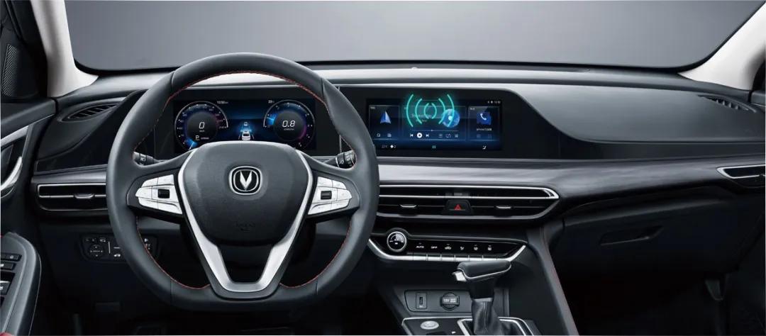 内饰部分,逸动PLUS同样承袭了长安汽车“PLUS家族” 的设计风格。这套内饰最显眼,也最具标志性的设计,莫过于两块相连的10.25英寸显示屏。这两块屏幕分别为液晶仪表和中控屏幕,大大提升了车内的科技感。同时,中控区域整体设计都是围绕驾驶席而布局,能带来不错的驾驶氛围。