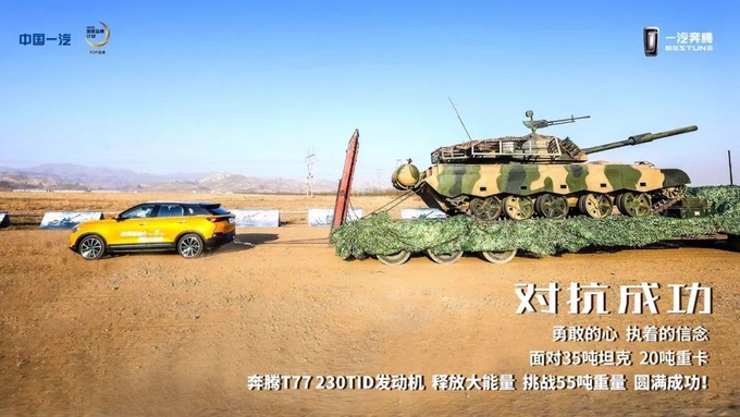 针对奔腾T77的动力表现,品牌颇有创意地开展了一系列“奔腾T77 PK 坦克”的挑战活动——一辆SUV在旷野之上拉动坦克、与坦克共舞的震撼画面,以最直观的形式展现了奔腾T77的优异性能。