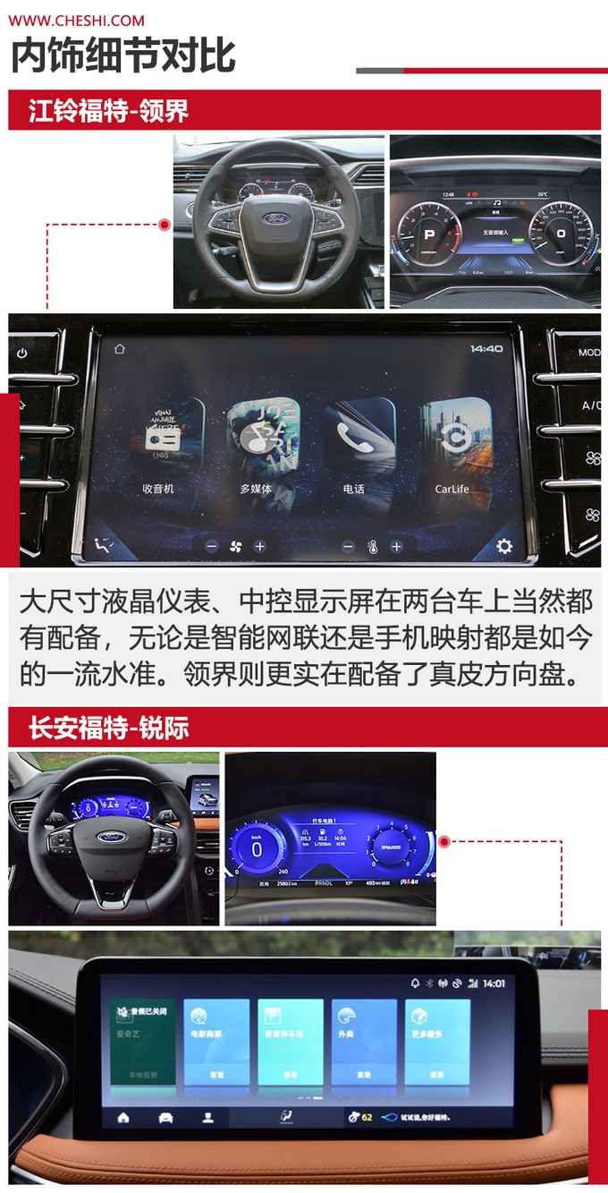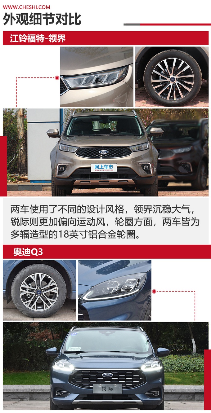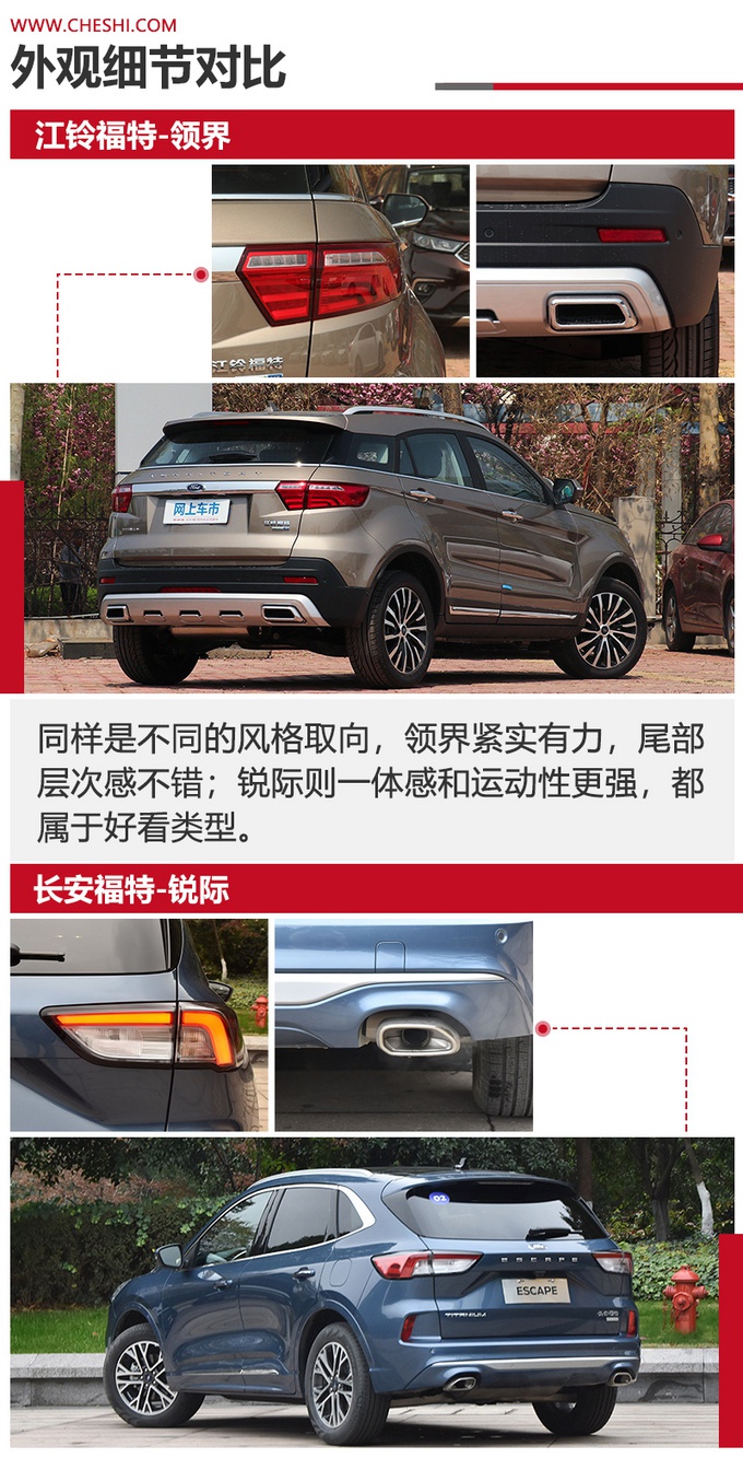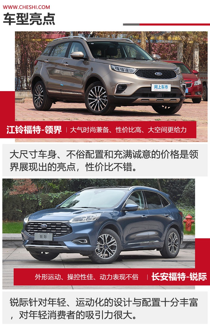 国内紧凑型SUV市场的竞争激烈程度无需多言,各品牌厂商也在这个细分市场投入了大量的优秀产品,对于消费者而言,就算是同一品牌下,也会产生该买哪台的疑问。江铃福特和长安福特作为福特汽车在国内的两家合资公司,各自旗下都有极具竞争力的产品,紧凑型SUV当中,江铃福特-领界和长安福特-锐际 (配置|询价)算得上能让消费者产生困惑改怎么选的两款,今天,就对这两台优秀车型进行全方面的对比分析,看怎么选最合适。