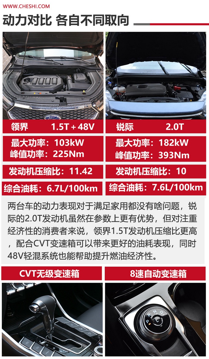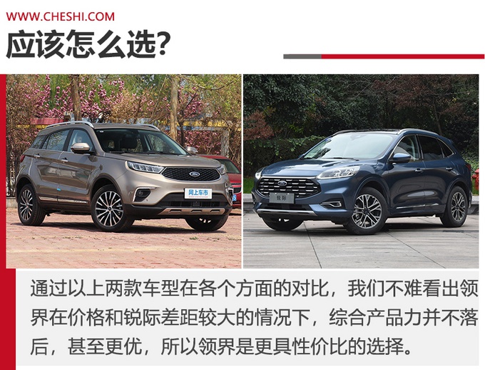 这两款都是各自产品序列当中极具市场前景的车型,目前汽车消费市场中对紧凑型SUV的需求特别高,价格、空间以及动力匹配都比较贴合消费者首次购车的需求,当然,性价比才是关键。总的来说,领界和锐际都十分符合上面提及的特点,而买谁更好呢?由于两车的价格区间差距比较大,为了对比更加客观,我们选取了各自最新款中两台配置相近的车型,领界 EcoBoost 145 CVT 尊领型PLUS和锐际 四驱嘉享款。