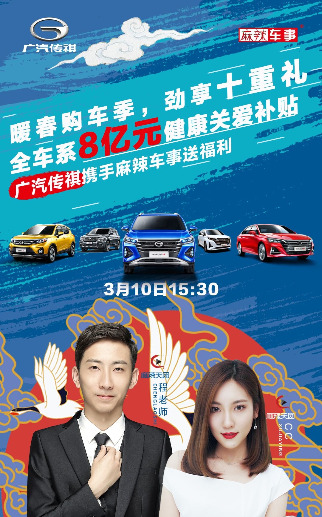 此外,在明天下午(3月10日15:30),广汽传祺还将联合麻辣车事,在线直播“送福利”。