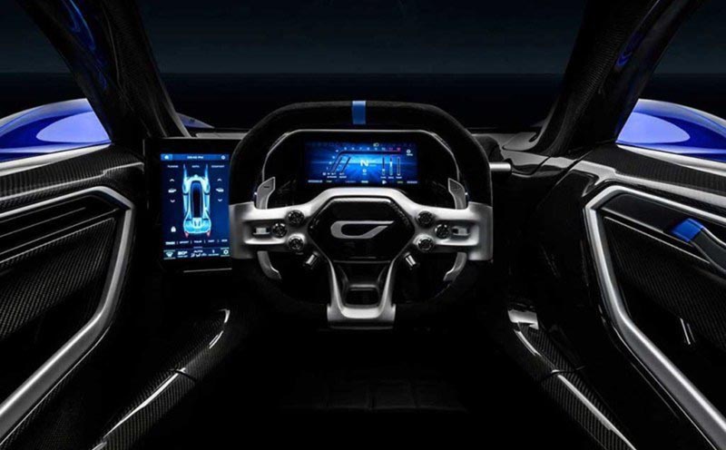 Czinger 21C采用1+1前后座位的布局,方向盘形状是不常见的方形设计,除了全液晶仪表盘外,方向盘左侧还配置了一个显示屏。多数功能的操作都集中在方向盘和仪表盘左侧的显示屏上。动力方面,该车搭载由Czinger Vehicles自主研发的混合动力系统,匹配Czinger自主研发的7速序列式变速箱,系统综合功率达到了1250马力(919千瓦),百公里加速时间仅需1.9s,马力重量比达到了1:1,即车身重量只有1250公斤左右。