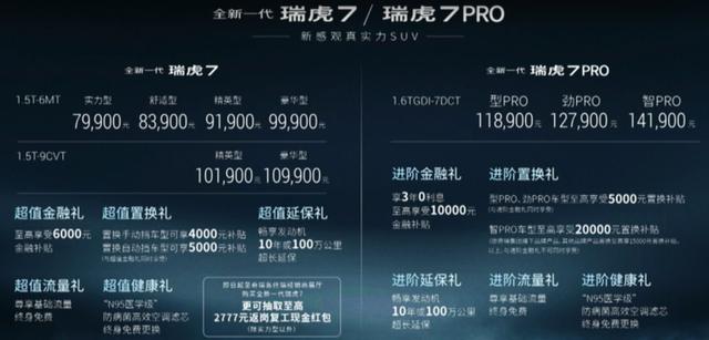 2020年3月9日,全新一代奇瑞瑞虎7 (配置|询价)/瑞虎7 PRO正式上市,售价区间为7.99-14.19万元。新车定位为紧凑型SUV,主打“健康、新潮、极致、智能”。购车还可以享受诸多金融优惠政策,包括置换补贴、发动机10年或100万公里超长延保、基础流量终身免费、“N95医学级”防病菌高效空调滤芯终身免费更换等。