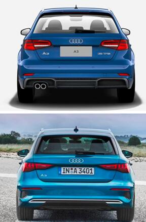 新款奥迪A3 Sportback整体设计更加犀利,前中网延续六边形造型,但好像做了压缩处理,两个边角更加尖锐,中网为蜂窝造型。两侧的大灯整体轮廓未变,但其中LED灯组改为了分段布局,科技感增强,下方前保险杠两侧的仿进气口做成三维立体造型,并有银色饰板搭配。车身长宽高尺寸分别为4340*1820*1430mm,轴距为2640mm,和现款相比,整体尺寸都有所增加。侧面腰线更加丰富,轮圈同样为五辐式旋风设计,但造型更加立体。