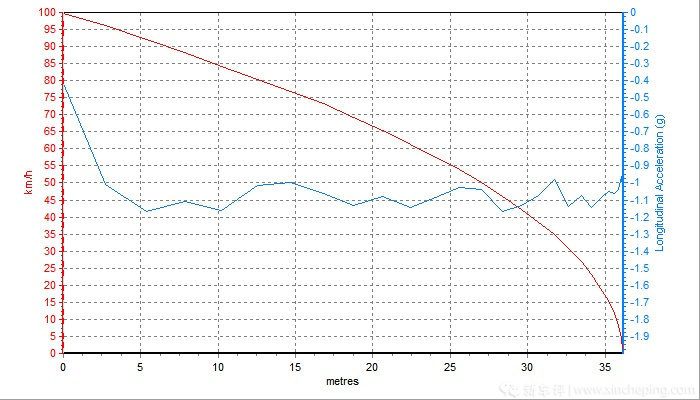 全力踩下刹车,你能感受到制动力非常均匀,轮胎抓地力和底盘对于车身的支撑性都很好,测试时的点头现象不明显,ABS工作不突兀。