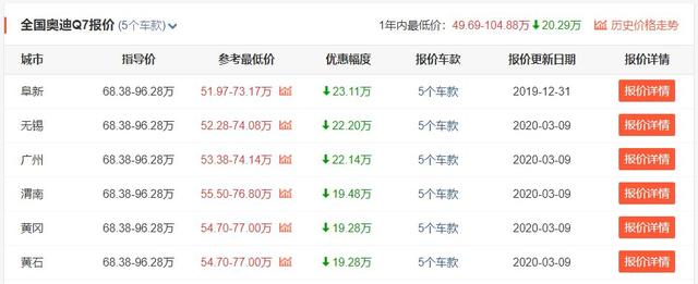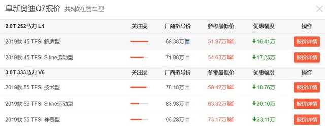 所以,如果我要向你们推荐一款除奔驰、宝马以外的豪华中大型SUV,那奥迪Q7绝对是不能错过的。至于价格,指导价68.38-96.28万元的奥迪Q7现在经销商参考价已经来到了51.97-73.17万,也就是说咱们最低花50万多一点点就能入手这样一台奥迪Q7了。另外值得说到的一点是,指导价96.28万元的顶配也就是2019款 55 TFSI 尊贵型现在终端拥有23.11万元的最高优惠,最低仅需73万出头就可入手,对于那些想买BBA但却碍于奔驰宝马车型太贵的消费者来说,奥迪Q7就是最适合的选择了,师哥推荐购买。