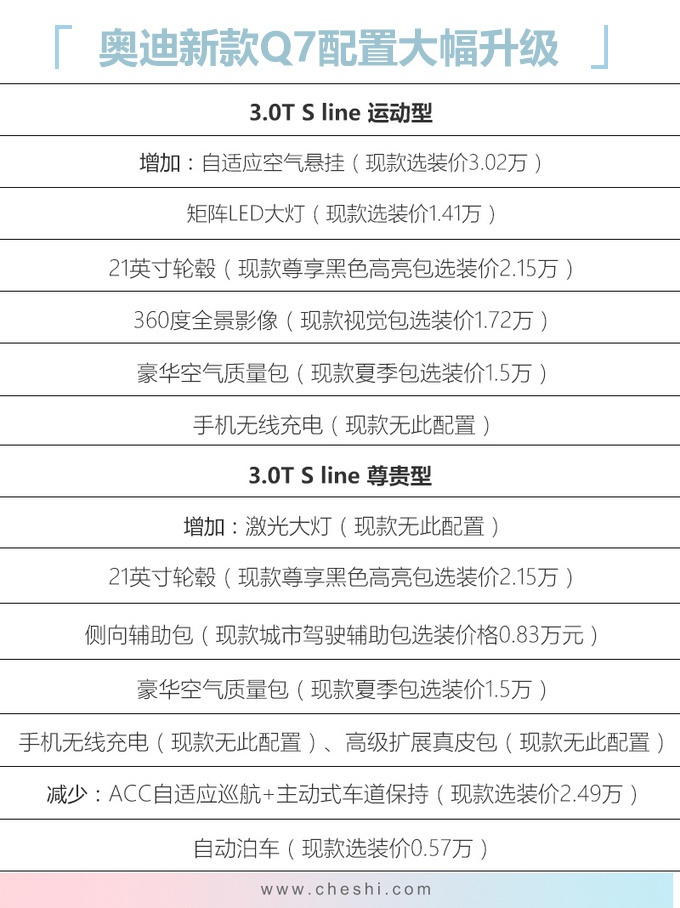 新款Q7尺寸方面进行了微调,车高提升了25mm。动力部分新车搭载的2.0T、3.0T涡轮增压发动机满足国六排放标准(改款前未满足),48V轻混系统的使用优化了油耗水平,3.0T动力参数介于主要竞品宝马X5、奔驰GLE (配置|询价)。