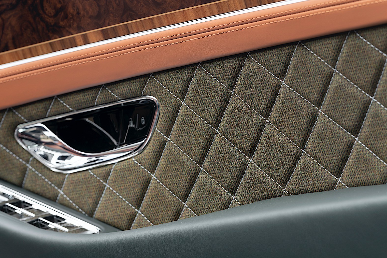 Mulliner在这台宾利的内部使用了非常多的马术元素。例如车内的实木饰板、座椅头枕,都带要“马术骑手”的印迹。车门版处类似于羊毛的织物材料也是非常经典的英国元素。
