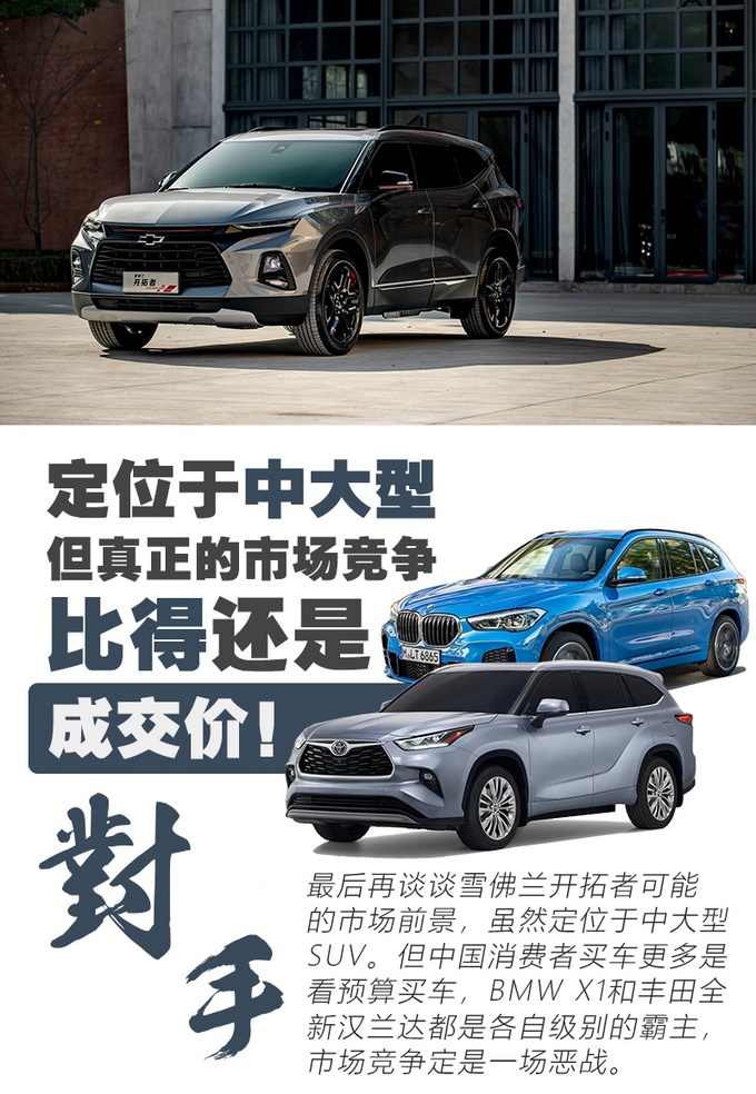 最后的结尾给消费者说一点实用的干货,对于雪佛兰开拓者来说未来的竞争对手是多元化的。因为其实中国绝大多数的消费者,当他手上拿着这笔预算,会考虑他能买得起的很多车型并非仅限于中大型这个级别。全新汉兰达 (配置|询价)将在今年晚些时候登陆,这个“大魔王”从上市开始加价,一直加到到了即将换代,市场火热程度可见一般。而BMW X1以不错的车内空间结合品牌光环,也会给开拓者这些主攻性价比的车型带来极大的影响。至于什么消费者会适合选择开拓者呢?就看那些对空间有刚性需求,同时又想追求年轻实用的群体吧。