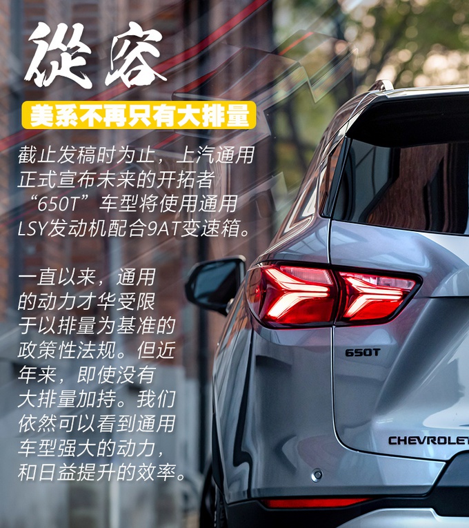 北美市场的开拓者目前有三款发动机,2.5L和3.6L自然吸气发动机,受限于与排量挂钩的消费税政策和本身动力水平和效率水平应该都不会被引入国内。那同时作为国际同步车型和平台架构的关系,所以仅存的代号LSY 2.0T发动机和9速手自一体变速箱的组合就成为了必然选择。而在四驱系统上,此类城市SUV多为以多片离合器的适时四驱,搭配多路况驾驶模式新选择系统。以通用车型的动力储备来说,绝对不会被人落下口实,只是还要看具体的油耗表现如何。