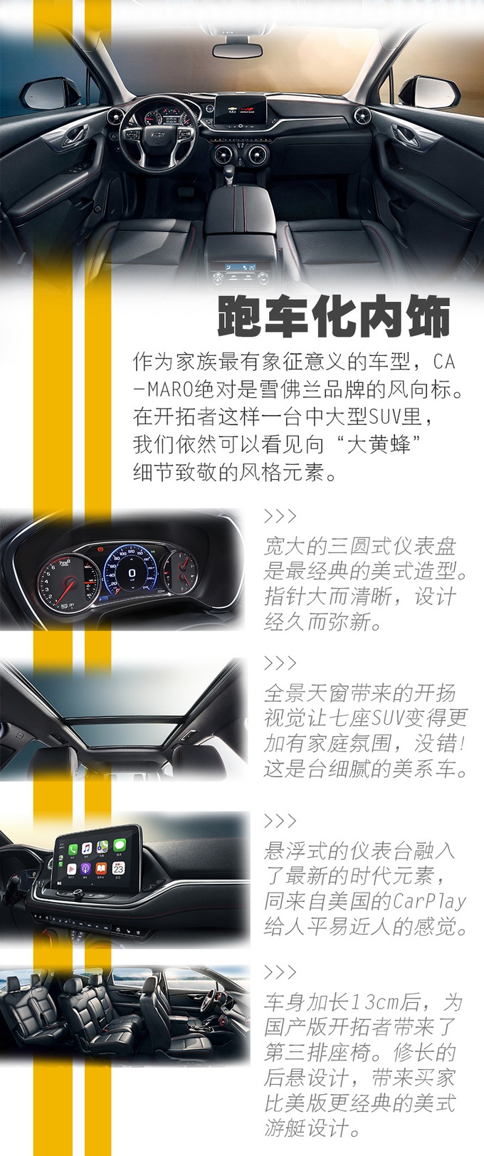 不只是外观设计,全新开拓者的内饰风格也是极具跑车化元素。炮筒式的空调出风口和“大黄蜂”如出一辙,随处可见的缝线设计让它与同尺寸SUV油腻感划清了界限。同时还有雪佛兰在华一直以来的超高性价比:各种科技化配置和大七座空间设计让实用性也提升到了一个新的高度。所以全新开拓者不但看起来“酷”劲儿十足,同时用起来也是倍感“暖男”情怀。