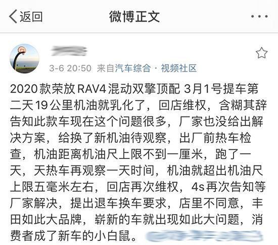 据车主曝料,他购买的车型是2020款丰田RAV4荣放混动双擎四驱顶配版本,3月1日提车仅行驶了18km,就出现了机油乳化和增多的情况。去4S店维权提出退车换车的要求,但遭到店方拒绝,等待厂家解决的答复。