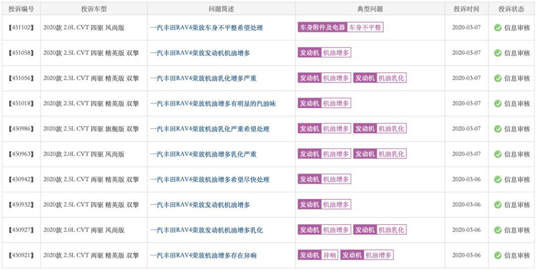 于是我们查询了第三方投诉网站,结果投诉RAV4荣放内容大多集中在机油乳化、增多、异响等问题,说明丰田RAV4的这个情况并非个例,而且以2.5L混动版本居多。事实上,丰田机油乳化的情况在丰田亚洲龙 (配置|询价)和雷克萨斯ES (配置|询价)也同样存在,因为它们都是采用的油电混合驱动,搭载2.5L自吸发动机。