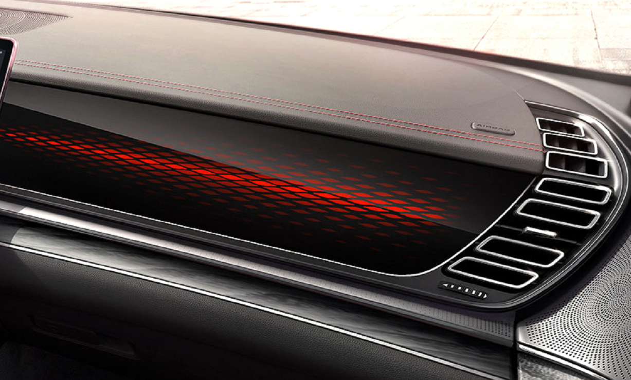 此外,从图片中我们可以看到,它的副驾驶前方还带有“龙鳞”纹理的氛围灯,这可以看作是比亚迪Dragon Face设计语言在内饰上的延展。
