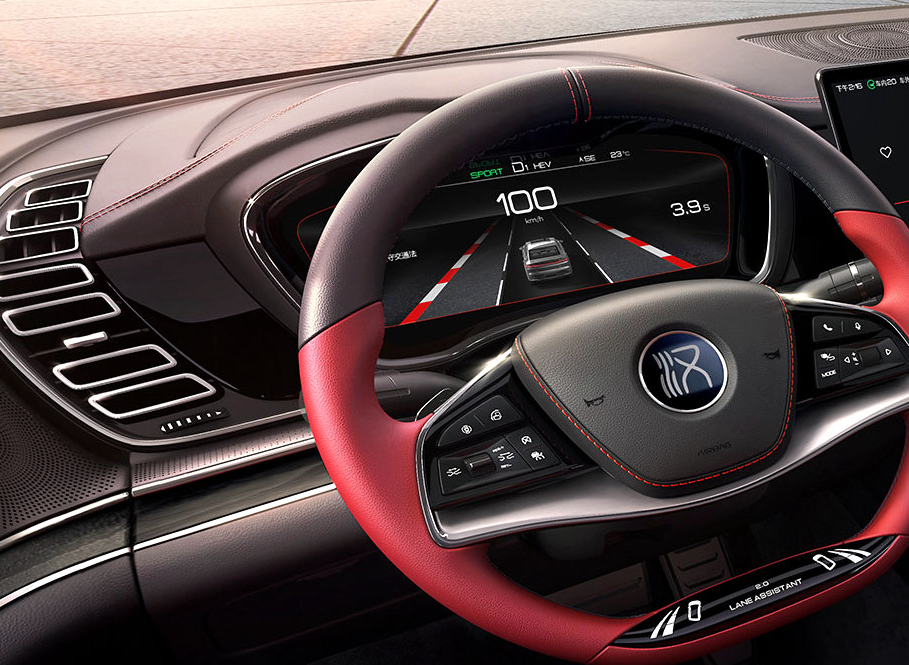 它的方向盘采用了两幅式设计,并且底部带有“2.0 LANE ASSISTANT”字样,这可能预示在比亚迪汉 上搭载了优化后的辅助驾驶系统。