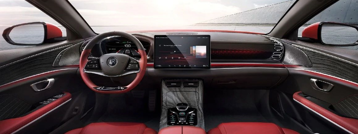 它的内饰采用了对称式的设计,整体以红黑色元素为主。中控台和门板上应用了大量的木纹饰板,并且在车门扶手还有座椅上使用了白色缝线来点缀,以凸显它的豪华氛围。当然,全液晶仪表盘以及可旋转悬浮式Pad自然不会缺席。