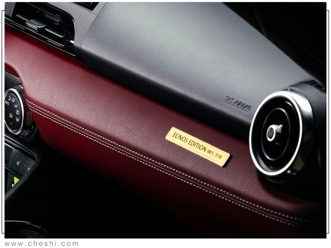 MX-5 Eunos Edition特别版外观采用了Jet Black Mica车身涂装,车身两侧还配备了Rays锻造铝合金轮毂。新车内部采用了深棕色Nappa真皮座椅,中控台副驾驶处还加装了限量版车型徽章。动力方面,新车将搭载一台2.0L自然吸气发动机,传动系统将匹配6速手动变速箱。