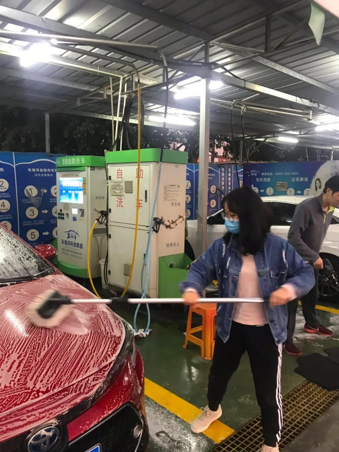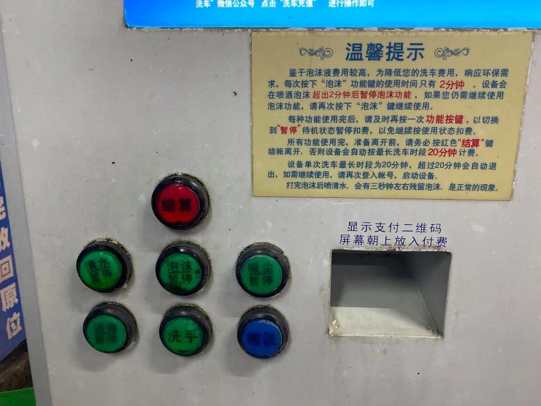 接下来就是喷泡沫了。据说泡沫的成本比较高,每次限定2分钟使用。同样的,需要全车都喷到,官方建议在20秒以内完成,迅速旋转一圈后,同样需要按下泡沫键暂停。接着,用洗车刷擦洗车身,那些黏黏糊糊的地方擦一擦,最好每个角落都不要放过。还别说,洗车可是一项体力活,想要洗刷干净需要细心、耐心。