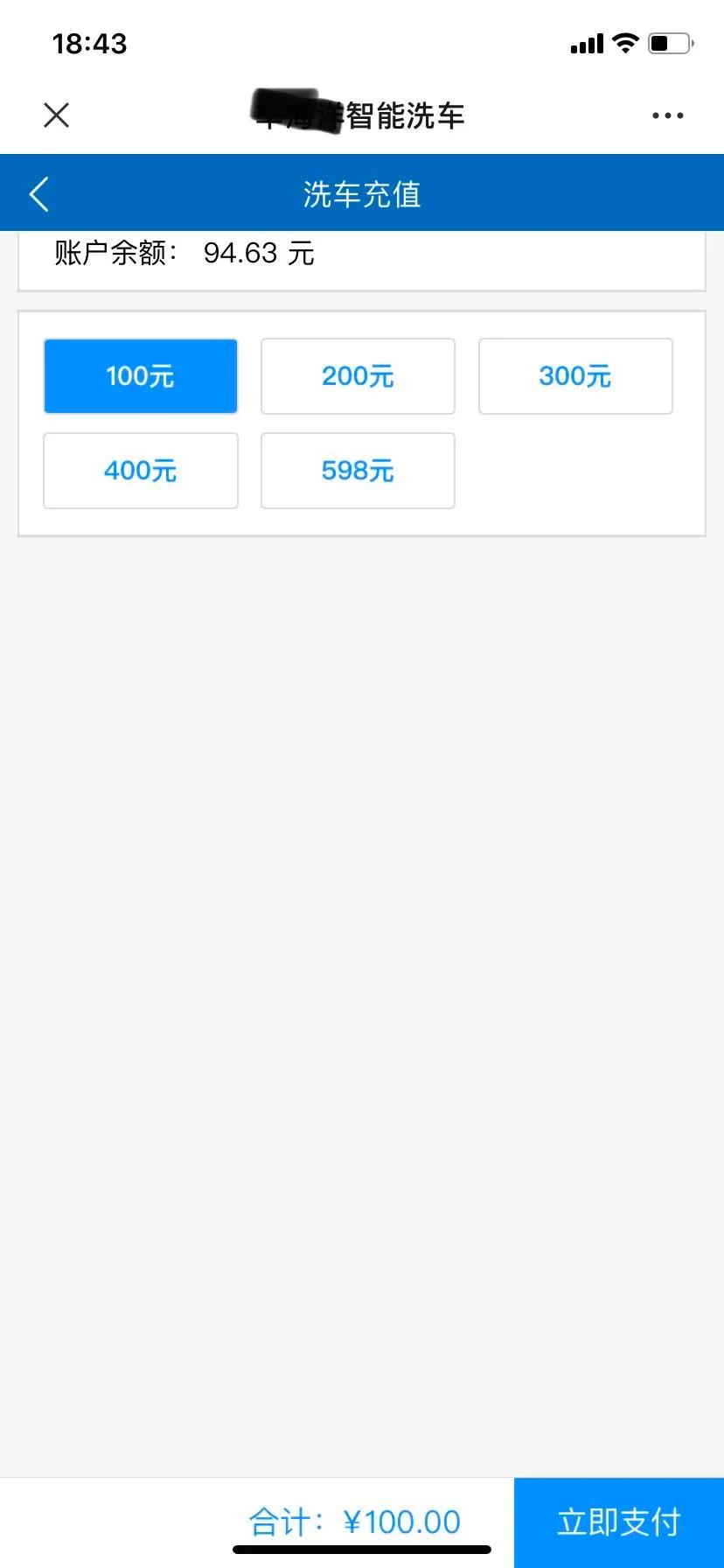 感觉洗得差不多就可以冲水了。但这时,尴尬的事情发生了。清水枪不出水,试一下泡沫枪,同样没有反应。再看看机器,账户也被强制退出。咋回事?小编一脸懵,赶紧询问有经验的同事,原来是账户里免费赠送的6块钱用完了,现在需要重新充值才能继续使用……(说好的第一次免费洗车?)这个时候,人为刀俎我为鱼肉,只能打开充值页面,最低充值100……套路太深了!
