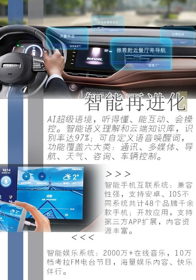 新车将智能网联系统升级到了V2平台,V2平台在智能语音、智能娱乐、智能出行、日程管理、路书、APP商店、车载Wi-Fi、违章查询等方面实现了30余项升级。其中,在智能语音识别方面,2020款哈弗F7搭载了科大讯飞智能语音识别系统,可实现车辆多项应用控制,不仅准确率极高,还能根据上下语义关联自动识别语意,十分智能。