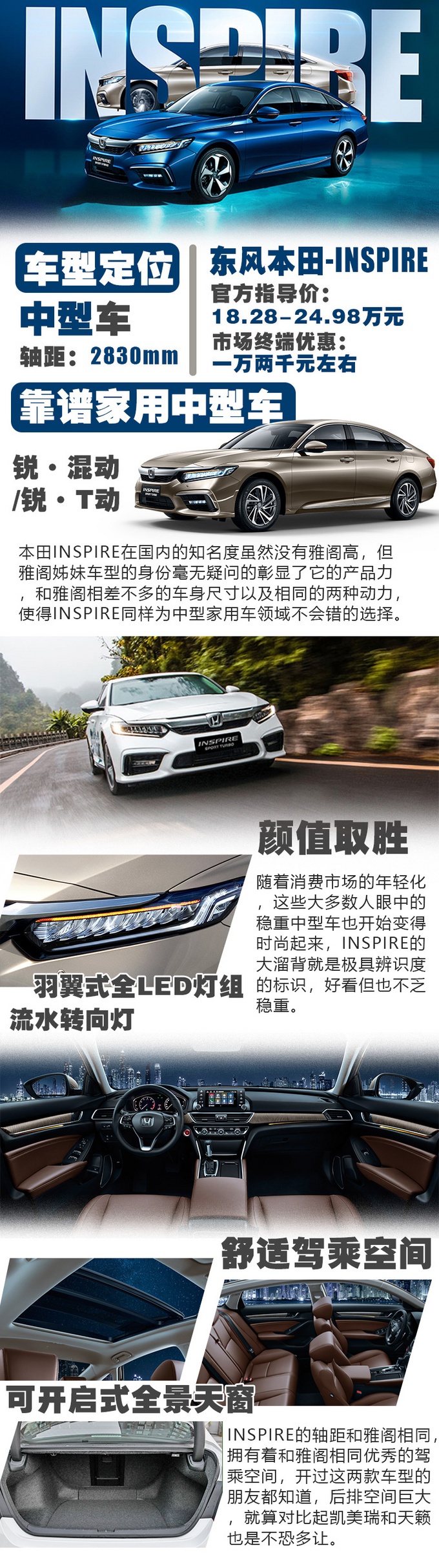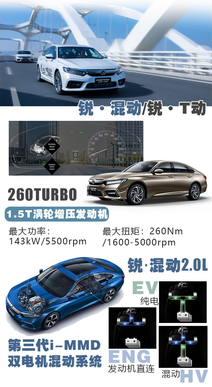 在中型车领域,东风本田INSPIRE (配置|询价)还是有着很强的竞争力,对比姊妹车雅阁,目前在售的车型车款也要更新。INSPIRE的溜背造型时尚、后排空间大,18.28-24.98万元的价位区间所对应的车型配置也比较合理,且还有终端优惠。如果您有想法购入INSPIRE,笔者推荐选择锐·混动2.0L车型,其所搭载的第三代i-mmd混动系统,发动机、电机、变速箱及电池性能都有全方面提升,能耗表现也更好,目前工信部综合油耗仅为4.4L左右,不仅是家用,就算有网约车需求,也是经济实惠的首选。