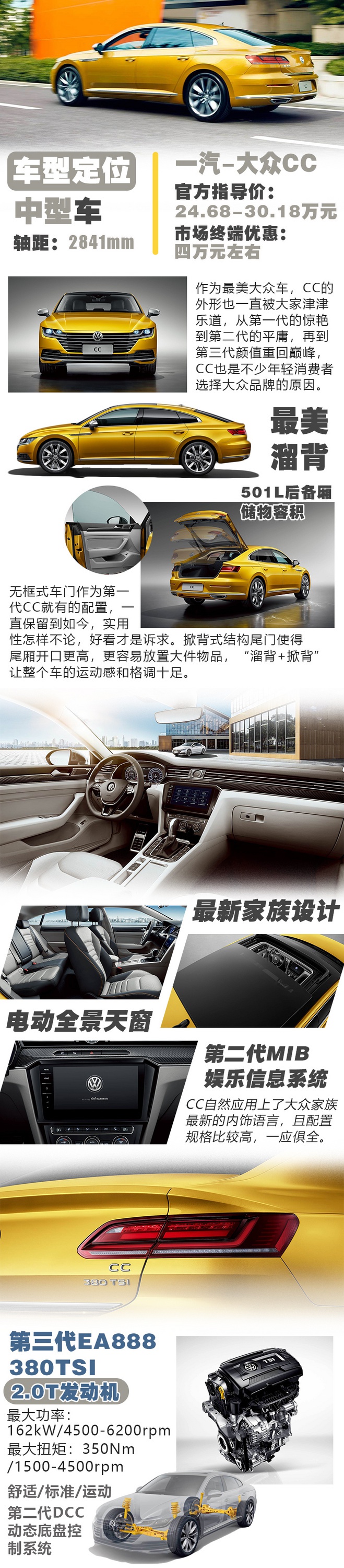 其实大部分购入CC (配置|询价)的消费者,主要购入点还是外形以及品牌,13-18款的第二代车型虽然算不上难看,但过于平庸,没有第一代的惊艳感,让很多消费者犹豫不决。好在第三代CC重回了颜值巅峰,让最美大众车的头衔没有落下。外形好看、品牌硬朗、2841mm轴距也带来了比较宽裕的驾乘空间,CC 2020款目前还有比较大的市场终端优惠,就算选择顶配车型,30万也能落地,如果您一直对CC保持着关注,且犹豫过要不要买第二代CC的朋友,如今,更好看且实惠的第三代车型肯定是您想要的。