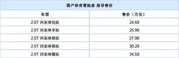 昨天,林肯旗下首款国产车型林肯冒险家选择以线上的形式举行上市活动,新车共推出5款车型,全新搭载2.0T发动机,并且提供前驱/四驱两种驱动形式选择,官方指导售价区间为24.68-34.58万元。详细车型售价,请看下表: