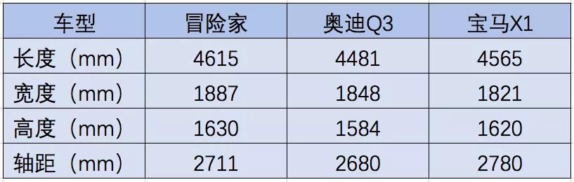首先是空间。相较于刚刚换代的奥迪Q3,冒险家在长宽高上的优势明显,分别达到4615/1887/1630mm。而在轴距上,虽然较宝马X1稍逊一些,但在整车长度上则优势明显,尤其是车长,足足多出了50mm。