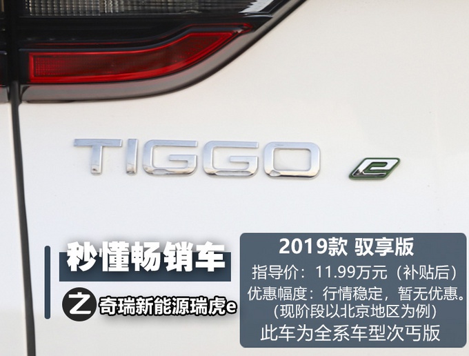 奇瑞新能源瑞虎e全系共推出4款车型,官方售价区间为10.99-14.39万元(补贴后)。动力方面,车辆搭载的永磁同步电机,总大功率为95kW,总大扭矩为250N·m,电池容量为53.6kWh,NEDC续航里程为401km。现阶段以北京地区为例,车辆的价格稳定,没有相关优惠幅度。而我们今天介绍的主角2019款 驭享版,官方售价为11.99万元(补贴后),并且通过上图也可以看到,即便是低配车型,配置方面也很实用。