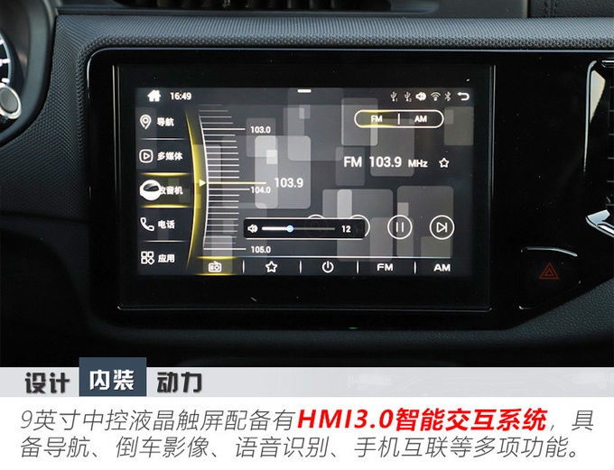 整体的功能按键布局清晰是车辆内饰设计的一大特点,并且真皮包裹的多功能方向盘、升降式旋钮换挡和中央扁平式出风口等配置的配备,让车内的质感得到增强。而9英寸中控液晶触屏也是整个内饰配置的一大亮点所在,其搭载有HMI3.0智能交互系统,在拥有语音识别、手机互联等功能的同时,还专门配备了应用程序菜单,车内乘客可根据自身喜好进行下载,满足消费者对于智能科技配置方面的追求。