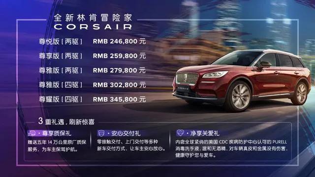 3月12日,林肯旗下全新紧凑型SUV——冒险家正式上市。新车共推出5款车型,售价区间为24.68-34.58万元。此外,作为林肯MKC的继任者,冒险家此次还特意为消费者准备了五年14万公里质保、零接触交付、PURELL消毒洗手液等多重大礼。