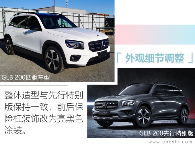GLB 200四驱车型外观与现款GLB 200先行特别版车型基本保持一致,细节方面有所不同。新车前、后保险杠中央的镀铬饰条改为亮黑色涂装,侧面行李架、车窗饰条提供亮黑色和银色镀铬两种样式,下方2种样式19英寸轮毂,与现款时尚型和先行特别版相同。车尾右上方加入“4MATIC”四驱车型标识,排气依旧为双边共两出式布局。