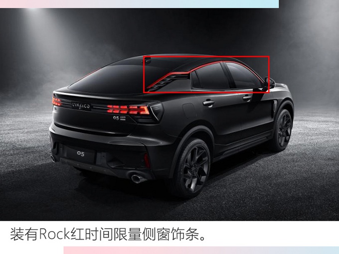 领克05时间限量版车身侧面采用了“Rock红”时间限量侧窗饰条,饰条从A柱贯穿至整车。红黑撞色设计更加凸显整车的时尚感与运动感。此外,新车也搭配20英寸哑光黑限量运动轮毂,车尾处还有专属的“limited edition”铭牌标识等。