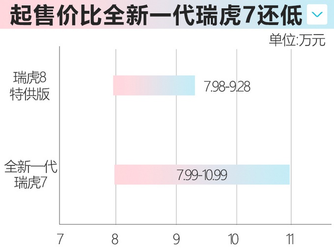 瑞虎8特供版与现款瑞虎8的差别其实就是新老款车型的一些差异,这里不做更多介绍。但这款车与全新一代瑞虎7在价格层面有大幅重合。至于如何选择,其实还得看具体的用车需求,毕竟“萝卜青菜各有所爱”。瑞虎8特供版赢在了空间大,主打实用性。而全新一代瑞虎7在造型、配置以及动力层面更容易获得当下用户的喜爱。
